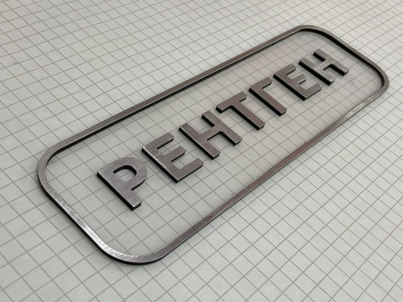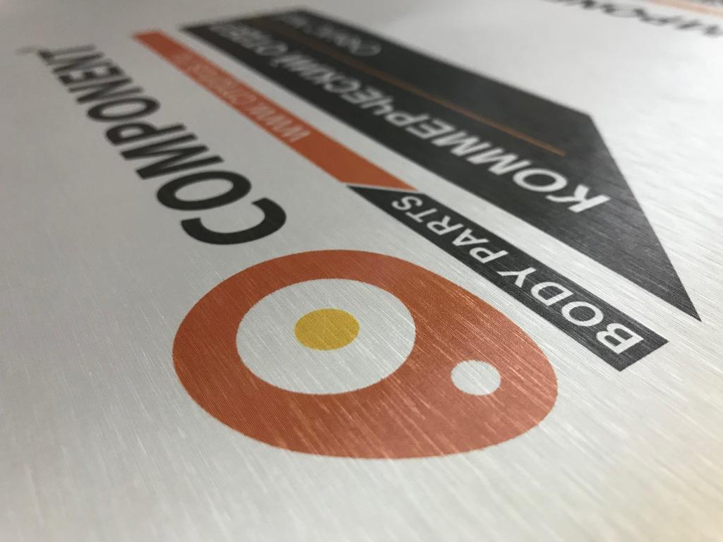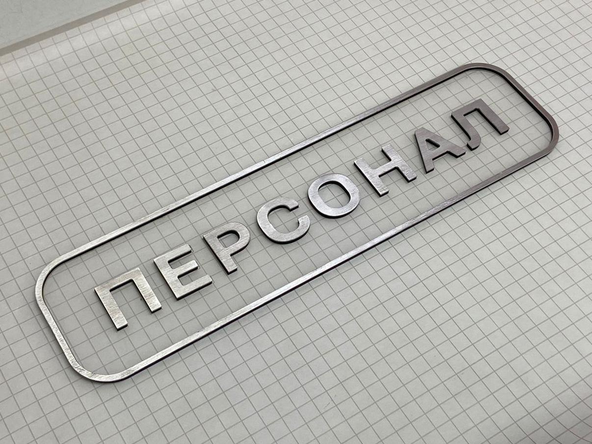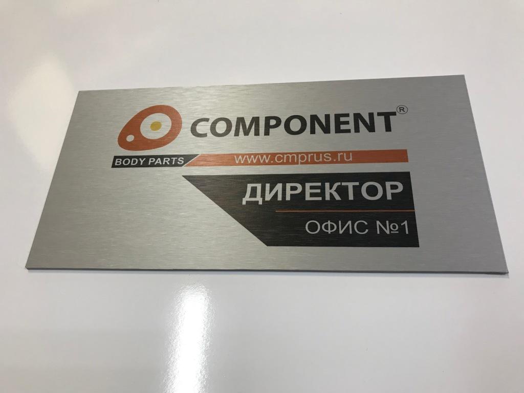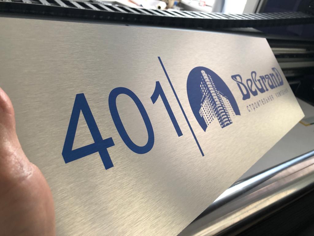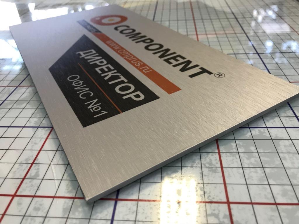 Данная табличка изготовлена из пленки под шлифованный алюминий, на саму пленку мы нанесли печать. Основа может быть: если на улицу, то лучше алюминиевый композит 3мм, если в помещении - то пластик Пвх 3мм.